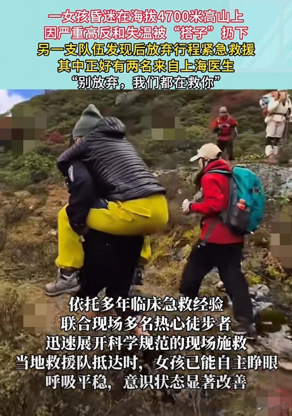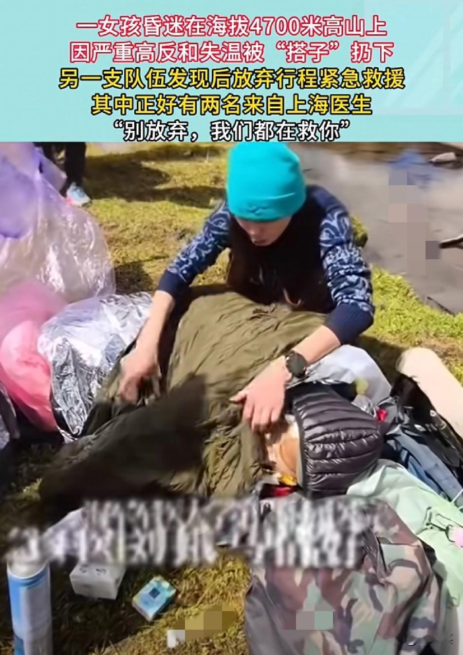 刷到这事儿我心都揪紧了 一女孩在海拔4700米高山上因严重高反 失温昏迷 被同行搭子扔下 另一支队伍发现后,放弃行程紧急救援 队伍里正好有两名上海医生,他们赶紧施救:“别放弃,我们都在救你!” 户外搭子结伴,遇到危险是该互相扶持还是自顾自 这事是提醒我们选对同伴,还是让我们看到了陌生人的暖?