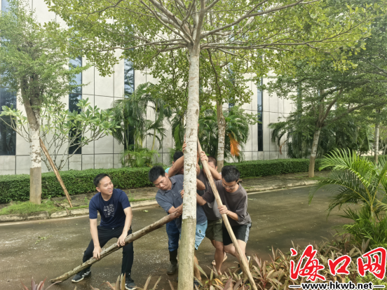 志愿者对倒伏树木进行扶正。(海口综保区供图)