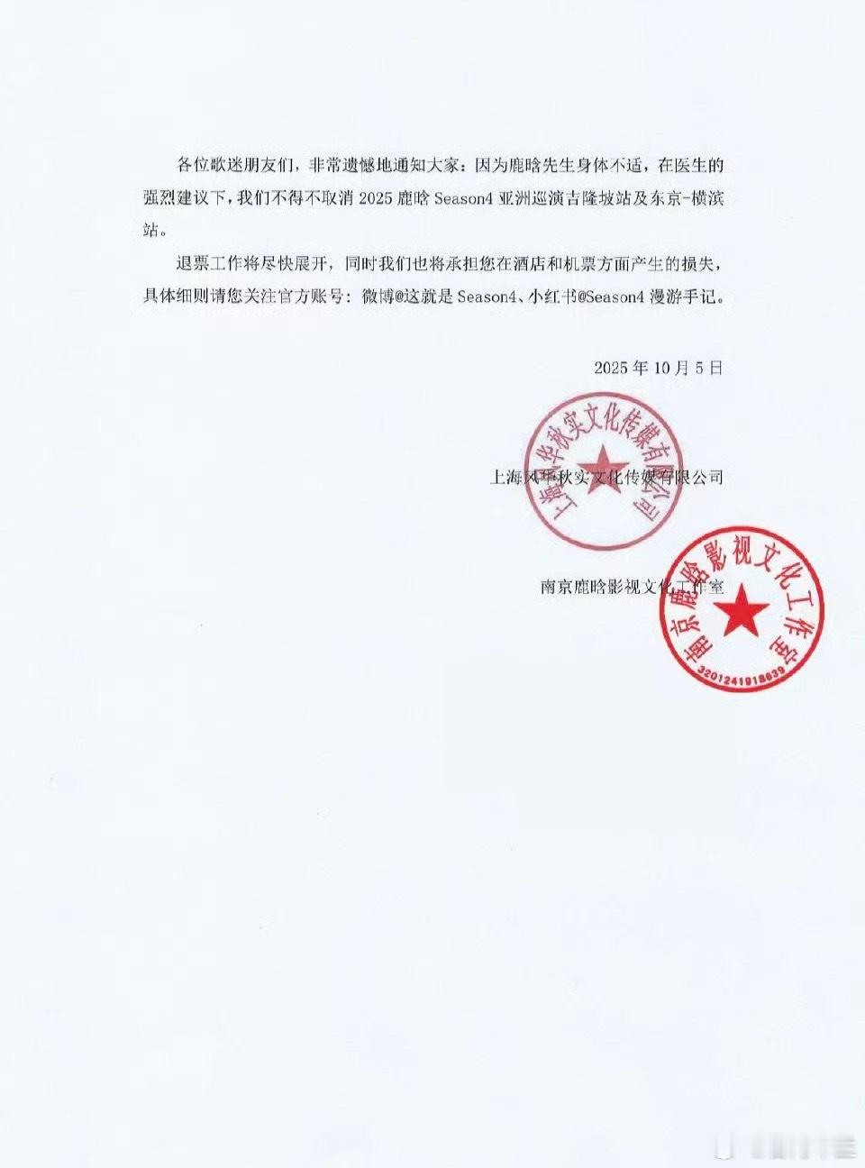 公告明确,退票工作将尽快展开,同时将承担粉丝因演出取消产生的酒店和机票损失。鹿晗工作室随后转发公告致歉,称珍视并感激粉丝为这场相遇所做的准备与奔赴,详细退票及补偿方案将通过