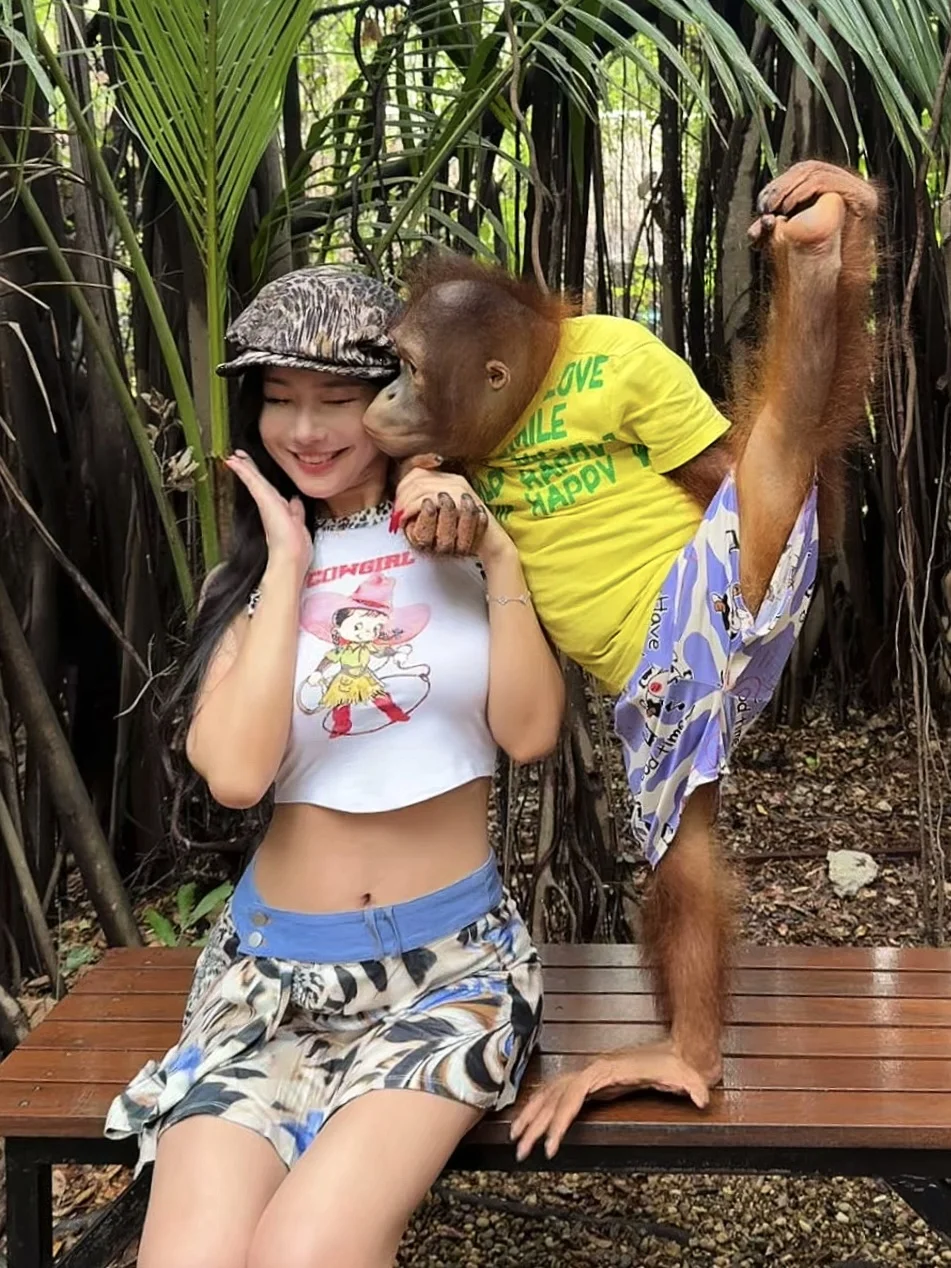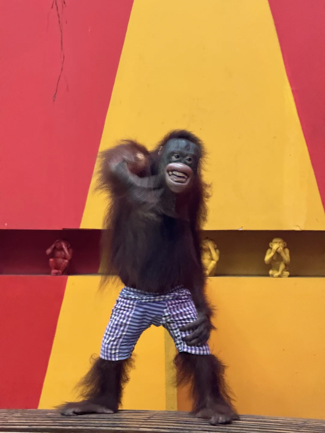 1️⃣网红猩猩—有一大一小2只(分开算钱),猩猩一套动作行云流水,熟练的让人心疼,会抱抱会亲亲还会袭胸(据说是母猩猩),真的很可爱很聪明!⚠️猩猩16:00下班,上午会比较活泼