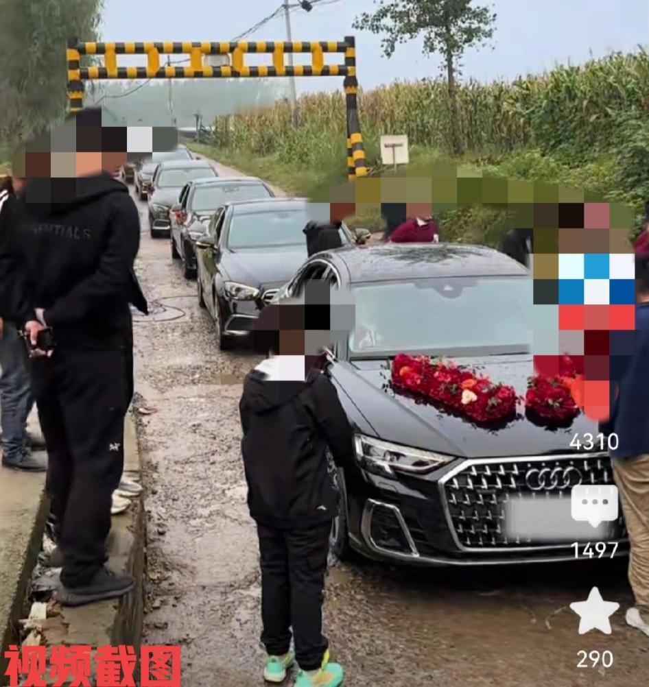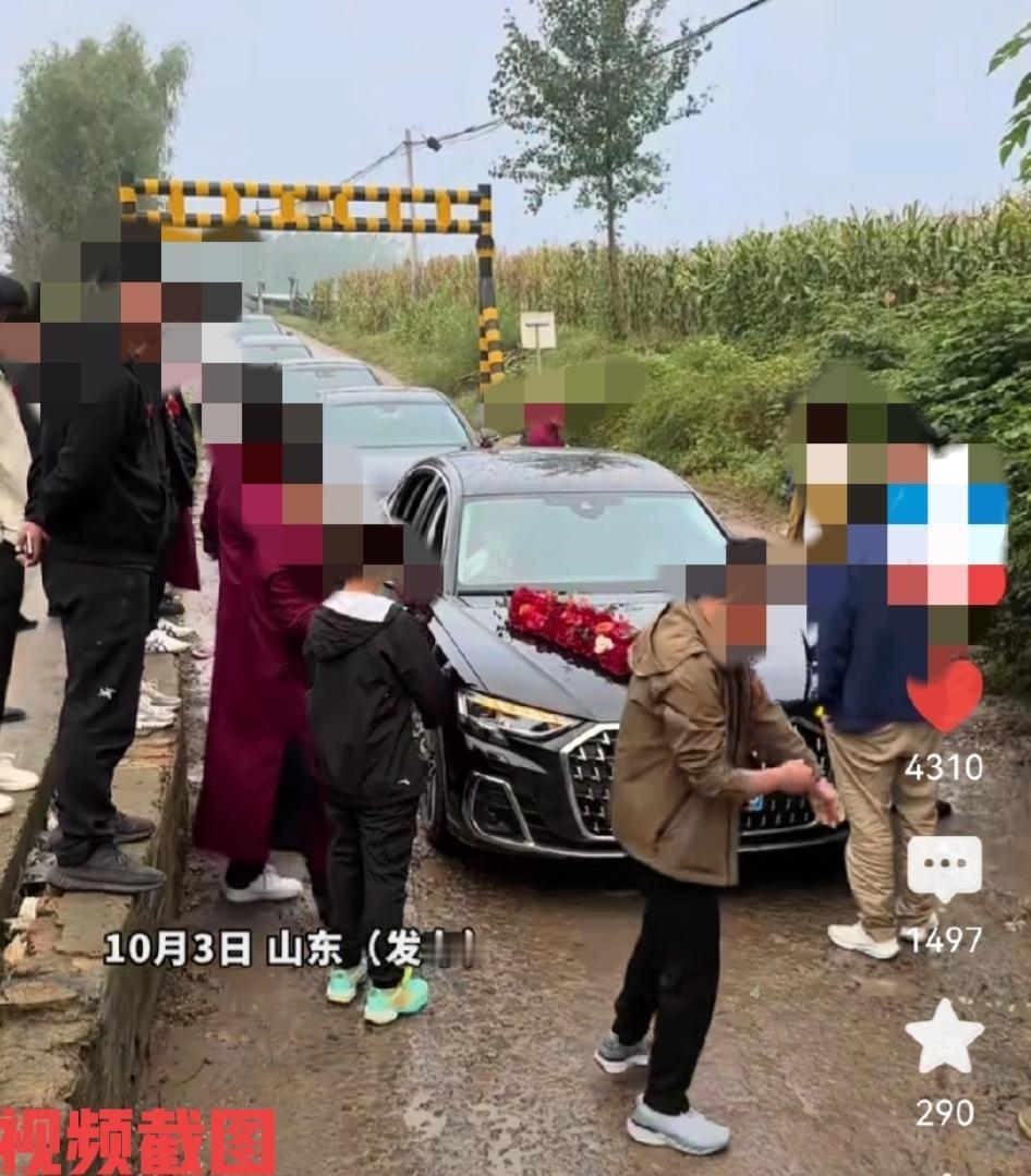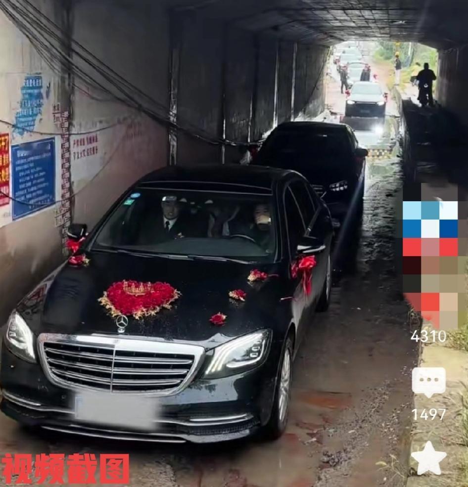 山东菏泽有两家结婚的车队。 此刻他们同时要经过一处涵洞的小路,现在他们相遇在面