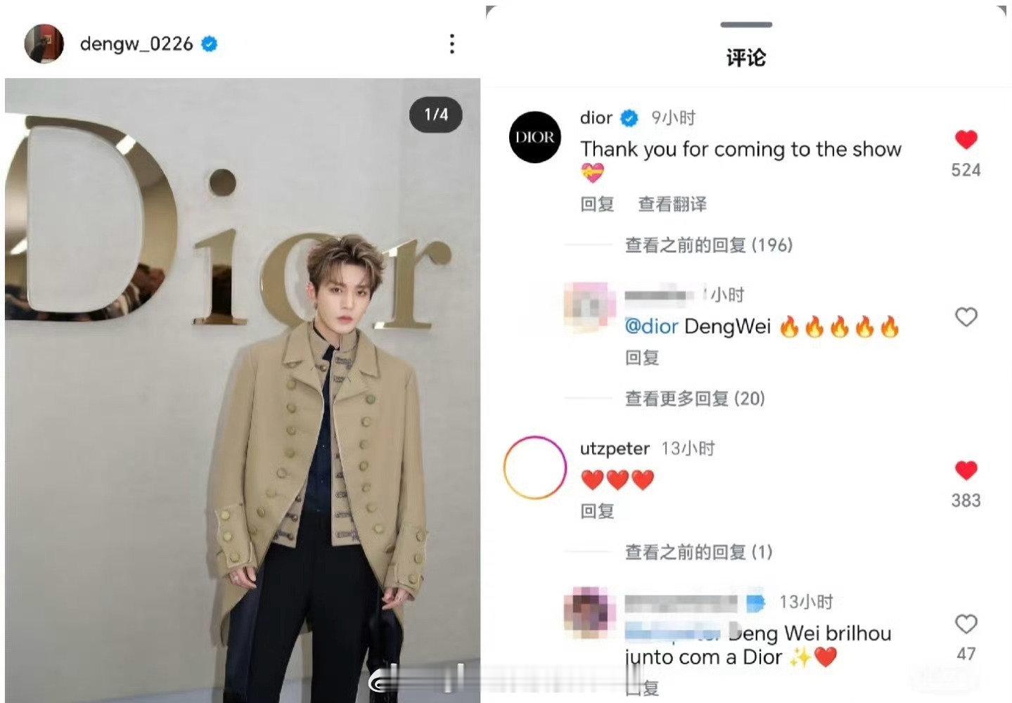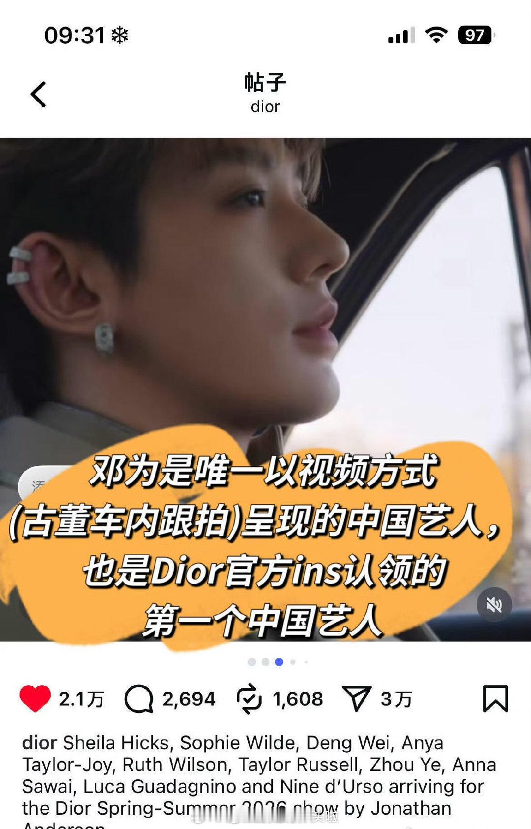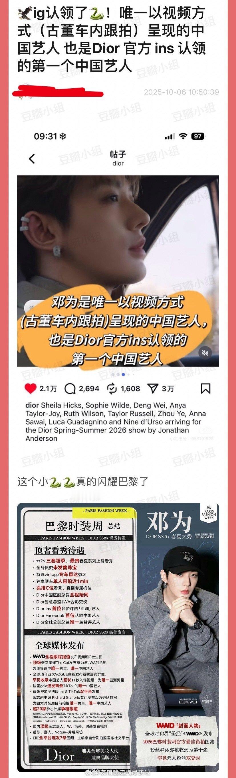 邓为是迪奥现任全球公关总监上任后首位公开认领的中国区艺人,也是官方ig唯一视频的方式(古董车内跟拍)呈现的中国艺人,更是官方ins认领的第一个中国艺人,这待遇算什么水平?