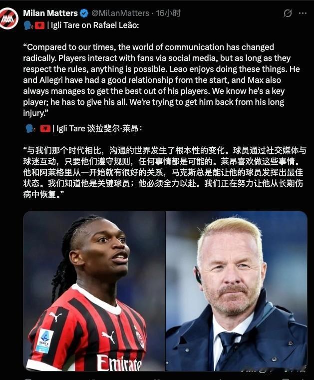阿莱格里对于莱奥表现并不满意,赛后接受采访阿莱格里已经不是委婉的表达了,阿莱格里是直接说作为中锋,莱奥必须要学会如何比赛,进球是前锋的工作,他必须要去完成这个工作。 米兰不进球的中锋不仅仅是莱奥,希门尼斯比赛时间比莱奥多多了,阿莱格里可没表达过希门尼斯没完成工作,阿莱格里说的是希门尼斯为全队做出了牺牲,他是米兰重要的球员,我对于希门尼斯的表现十分满意。阿莱格里开始对莱奥是哄着,现在看来是要鞭策了,个人觉得这样的鞭策没毛病,莱奥就是那种需要严格家长管教的阳光大男孩,之前教练没资历莱奥弄不了,现在阿莱格里教训他莱奥应该能听话。 莱奥昨天那两球没进我倒是觉得可以理解,毕竟刚复出还要找找状态。但是那个一如既往的懒散,看的真是脑壳痛,阿莱格里的话其实已经表明了对莱奥的不满意,不用过度理解,就是鞭策,现在只是希望莱奥早点适应新的位置找回状态,米兰需要他。