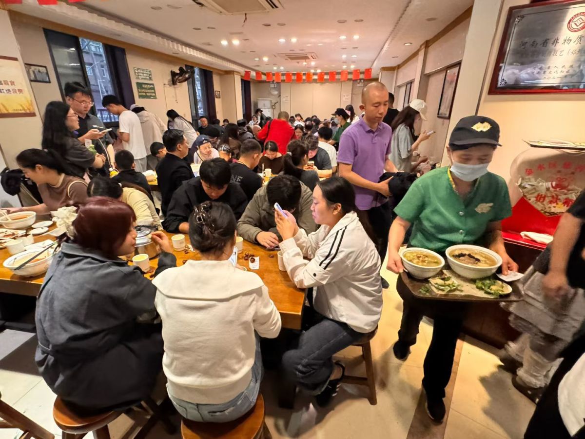 在合记烩面,后厨同样忙碌,党支部书记陈捷告诉记者,假期里全员在岗,中午连轴转,“翻台次数根本数不清,但只要看到食客喝完最后一口汤,就觉得值”。作为70多年的中华老字号,陈捷说“做好每一碗烩面”是不变的规矩:“羊肉选上等的,汤要熬够时间,面条得劲道,要让郑州烩面的招牌一直亮亮的。”