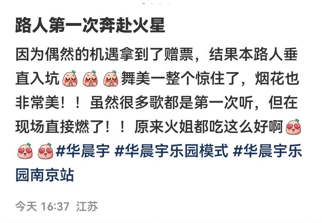 华晨宇南京站路人观感华晨宇的演唱会不仅仅是音乐,更是每一个细节的呈现!南京站的观众都感叹:“这个演唱会,绝对值得!现场的震撼力和温暖感,让人无比激动。”