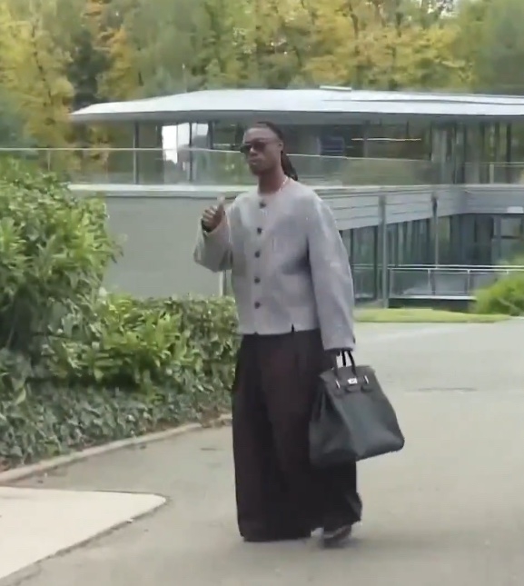 这是什么造型卡马文加到法国队报到:马褂+阔腿裤+手提皮包