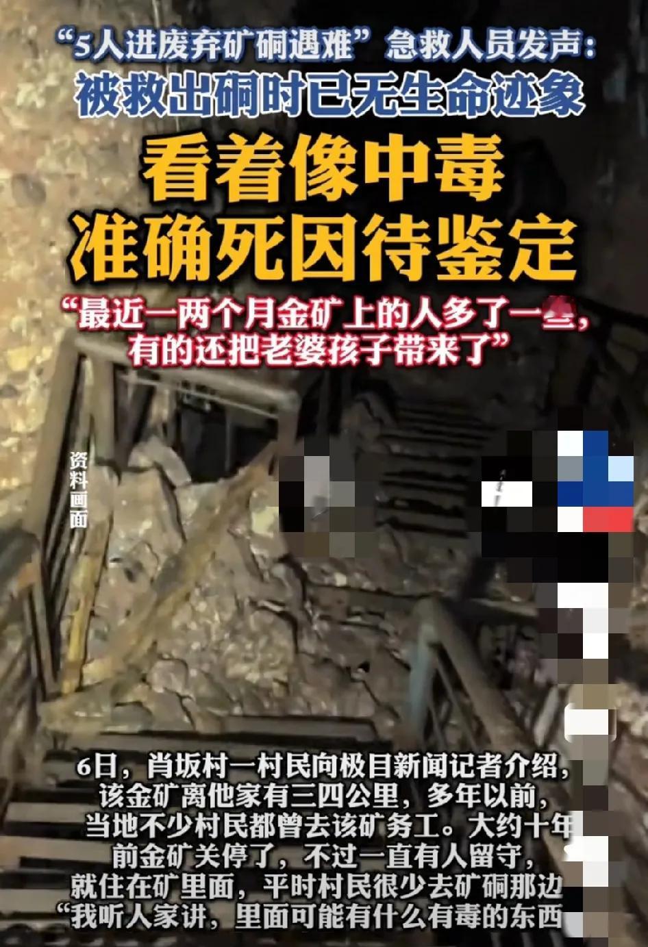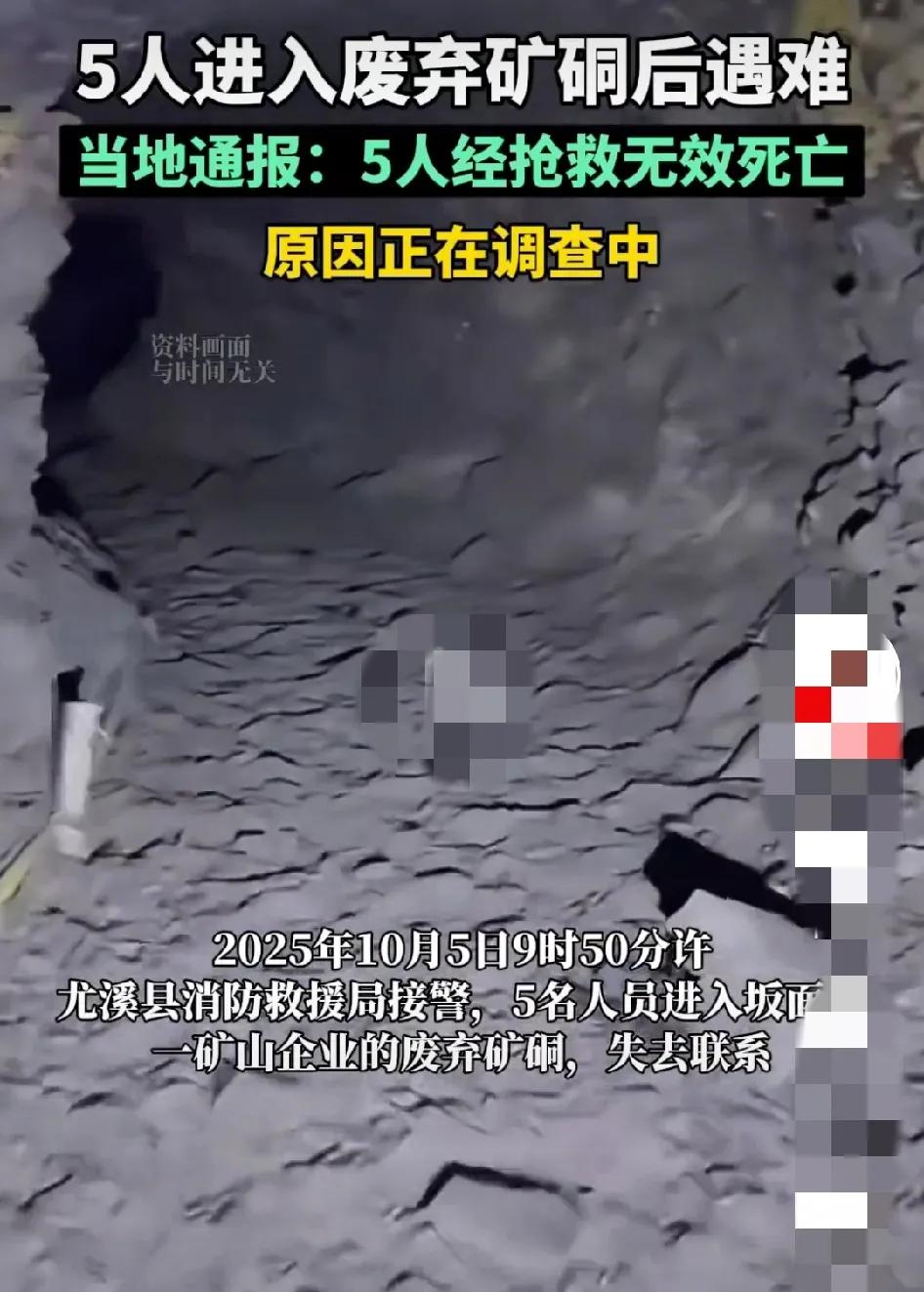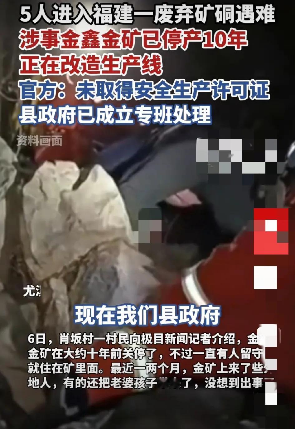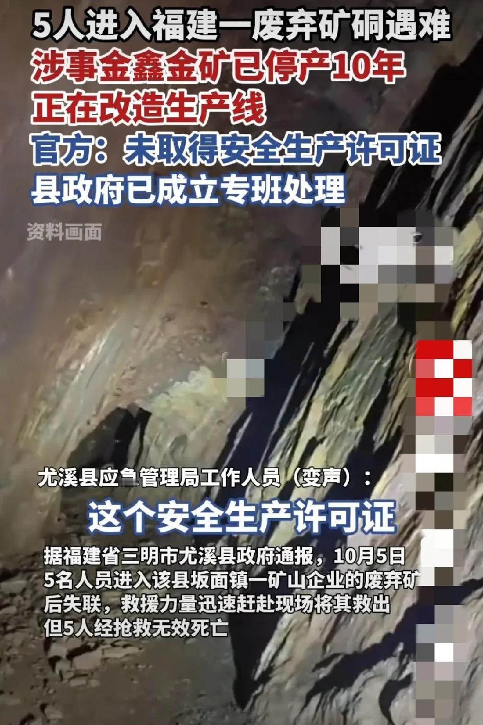 重大安全生产责任事故,监管不到位,人浮于事!可否有盗采金矿的嫌疑!还有,为什么停产的金矿,有外地人和家眷进驻矿区。这是典型的某些单位和人员不作为!具体情况坐等官方通报! 据报道,2025年10月5日,福建省三明市尤溪县发生一起废弃矿硐遇难事件,5名外地人进入金鑫金矿已废弃10年的矿硐后中毒身亡。金鑫金矿自2015年停产后,部分留守人员仍居住在矿区。2024年起实施生产线改造项目,但截至2025年10月仍未完成改造,未取得安全生产许可证。 再有,救援人员表示5人被救时已无生命迹象,疑似中毒死亡,具体死因需法医鉴定。涉事矿硐硐口长期封闭,但近期被人为打开。 另外,村民反映近两个月有外地人携带家属进驻矿区,推测为参与改造项目。但官方未证实其关联性,仅确认遇难者为外地务工人员。