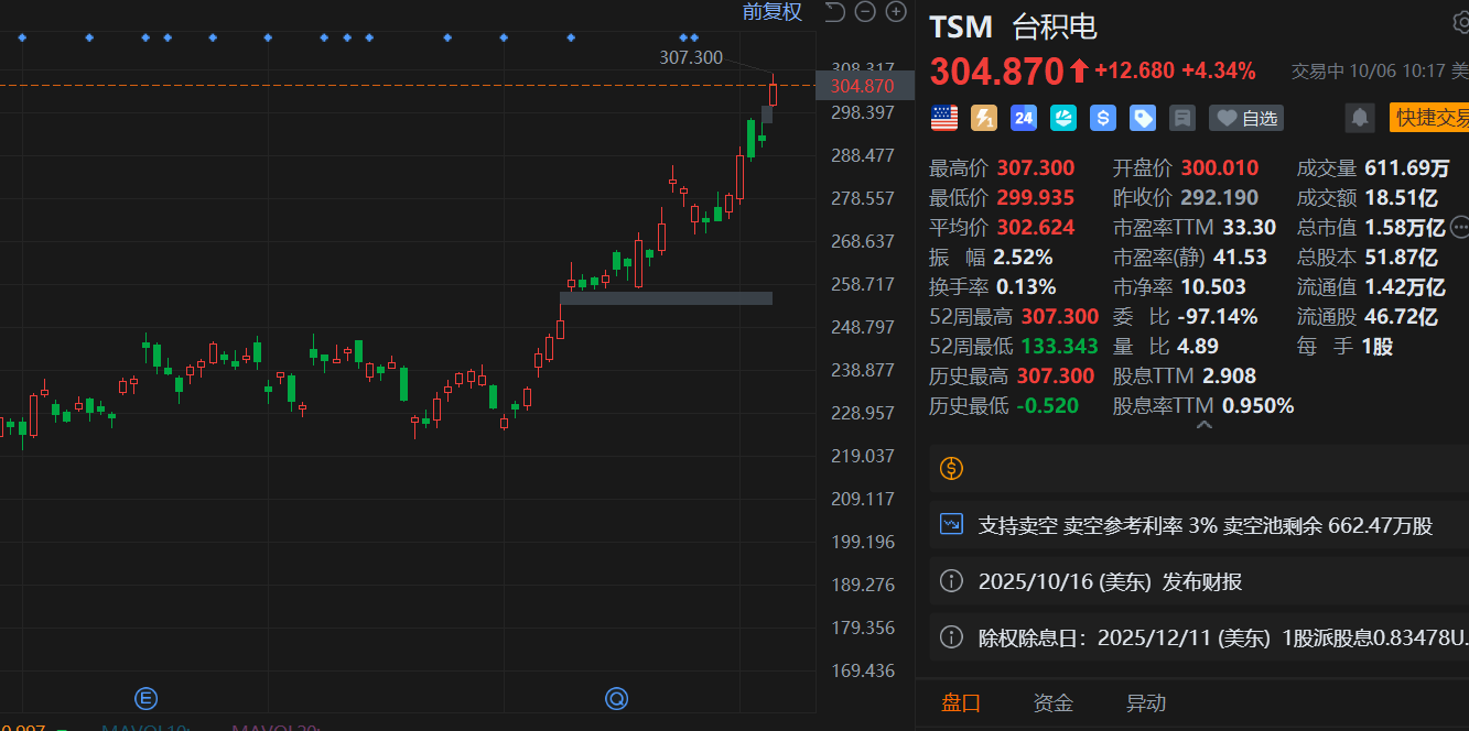 格隆汇10月6日|台积电(TSM.US)涨超4%,盘中高见307.3美元刷新上市新高价,总市值逼近1.6万亿美元。消息上,中国台湾地区高雄市市长陈其迈本月3日表示,台积电近日拜访该市政府并赠送了由高雄Fab22晶圆厂P1(一期)试量产的12英寸2nm工艺芯片晶圆。据悉,高雄Fab22是台积电在岛内规划的两大2nm先进制程生产基地之一。