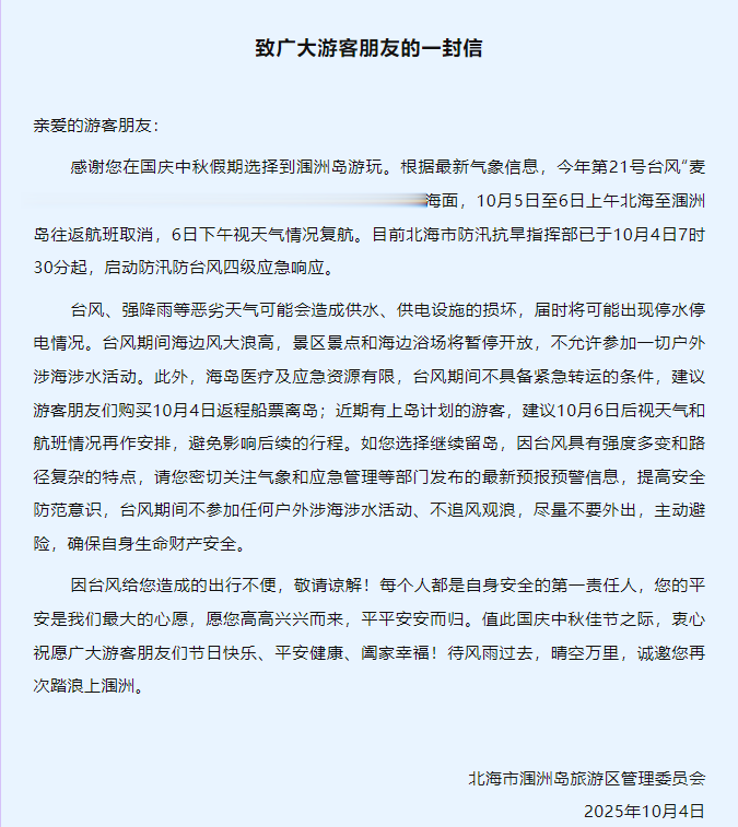 根据旅游区公告,10月4日航班不运送游客上岛,提前和加开离岛航班;10月5至6日北海至涠洲岛往返航班停航。涠洲岛景区及浴场于10月5日暂停开放,10月6日视天气情况动态调整开放情况。