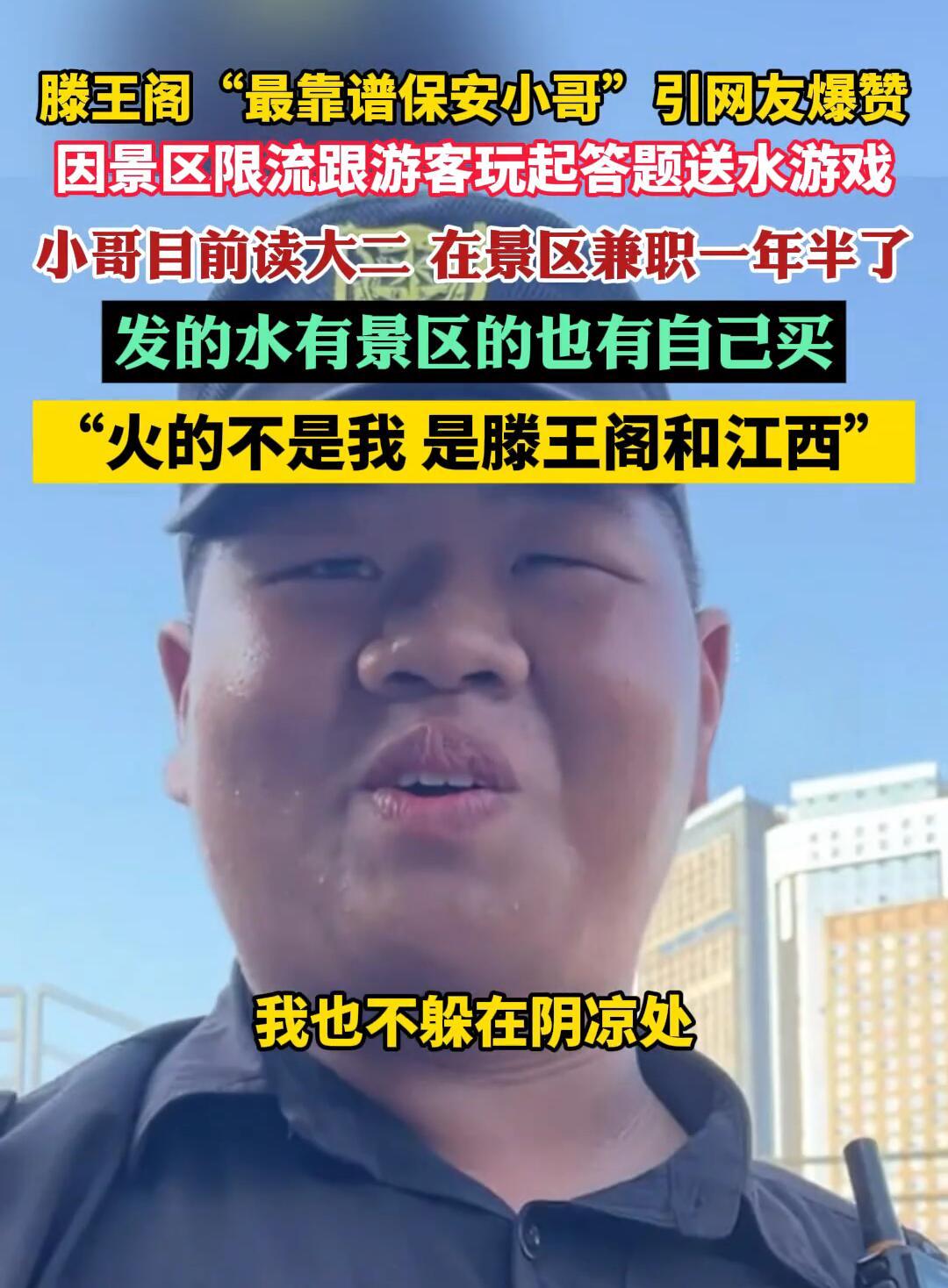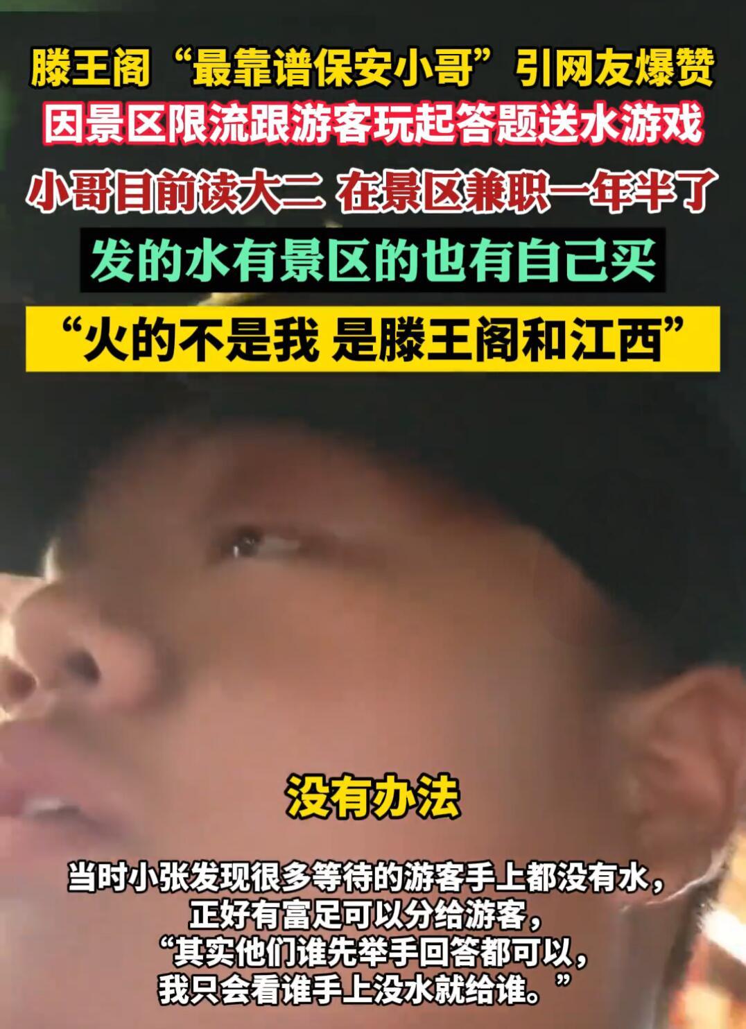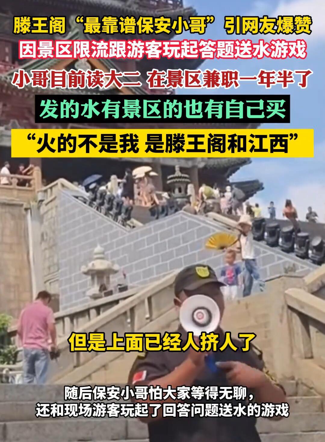 这个国庆节,南昌滕王阁有个保安小哥彻底火了! 当天景区人挤爆了,大太阳底下游客排队排得心烦气躁。这时候一个00后保安举起喇叭,上来先认错:“这是我们工作失误,我陪大家一起晒太阳!”就这一句话,瞬间把大家情绪稳住了。 更绝的是,他看大家等得无聊,直接搞起有奖问答。“滕王阁的滕王叫啥名字?”有人喊“李元婴”,他立马送水还夸人家厉害。后面又接着问“滕王是谁的儿子”,答不出来的还给提示。转眼间排队现场变成文化课堂,抱怨声全没了。 最让人想不到的是,这小哥才20岁,在滕王阁兼职当保安一年半了。他说不为挣那点工资,就是想来“守护滕王阁”。平时就特别热心,今年五一还救过落水的孩子。 现在他火得连央视都报道了,游客专门来找他合影。但他特别清醒,一直说:“别找我,多看看滕王阁的风景。火的不是我,是江西这片土地。” 要我说,这种人才是真正的文旅名片——既懂文化又会沟通,比多少宣传片都管用。一个兼职保安都能这么用心,难怪网友都说被暖到了。