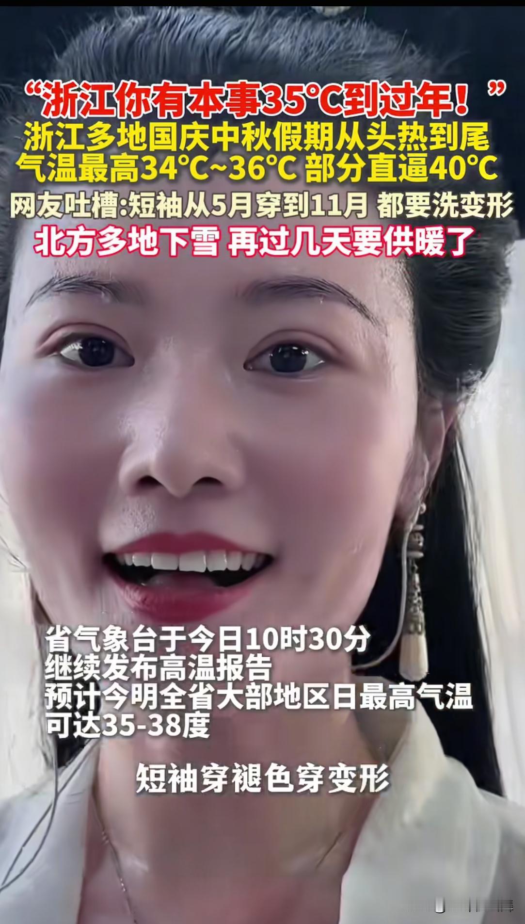 昨天是中秋节,阖家团圆的日子。但一则杭州小姐姐吐槽说自己的短袖衫穿变形了,要买第二波的消息冲上了热搜。 她说自己从五月就开始穿短袖了,现在到中秋节了,还穿着短袖,领口都穿变形了,必须要再买第二批夏装了。 可能北方人觉得很离谱,都十月份了,一些地方已经开始下雪、供暖了,杭州竟然还在买夏装?!如果他们了解到杭州中秋当天的温度,可能会更惊讶。因为杭州在中秋节这天发布了橙色高温预警:37.1℃。说实话,作为第一火炉城市的重庆人,都不得不对杭州的温度甘拜下风,因为这些天重庆也只有32-34左右。 而在中秋节当天最冷的是青海省的河南县,只有零下-21℃。两地温差达到了58度!这是真正的冰火两重天。 说到河南,河南省的网友比河南县的人感觉更不好受,因为河南下了太久的雨了,他们强烈要求把这雨分给杭州,山东网友也有这个要求!南北的冰火两重天,让夹在中间的这些地方雨下个不停,河南省一些地方的玉米甚至被耽误了收获。而一个河南农民因为没种玉米而种了夏季旱稻的前瞻性做法,让当地的村民佩服得五体投地,因为当地从来没有种过旱稻的,他是第一家,而今年丰富的雨水,让他的稻田长势喜人。 有人在外网上发布了中秋当天北方下雪发布霜冻预警和杭州发布高温预警的视频,让外国网友惊叹神奇的同时,也感叹和羡慕龙国的幅员辽阔,说只有在领土广袤的国家,才会出现这样的奇观!