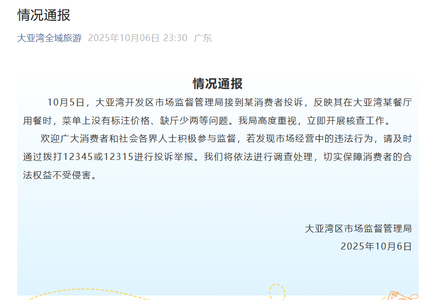 10月5日,大亚湾开发区市场监督管理局接到某消费者投诉,反映其在大亚湾某餐厅用餐时,菜单上没有标注价格、缺斤少两等问题。我局高度重视,立即开展核查工作。