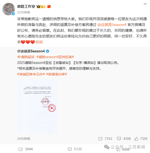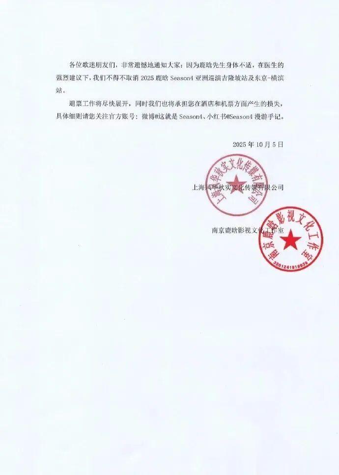 10月6日,2025鹿晗Season4亚洲巡演官博发布公告称,因鹿晗身体不适,2025鹿晗Season4亚巡[吉隆坡站][东京-横滨站]演出取消。