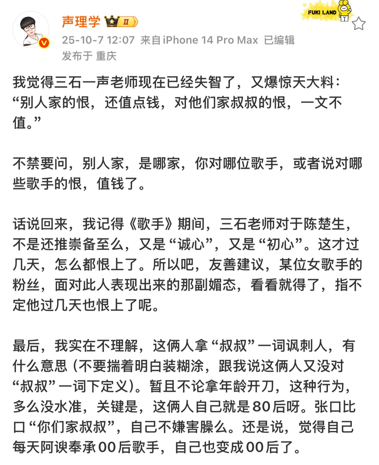 某乐评人说“对叔叔的恨一文不值”,那谁家的值钱呢? 哈哈哈,果然还是失智了。 一句话暴露了一切。 为啥有的恨值钱,有的不值钱呢? 因为有骨气的就是不惯着这类人。 如果口碑及音乐态度都是能花钱买的话,这世上就真的没有真正的歌声了。 我声明我家叔叔就是无价之宝、无人能及!