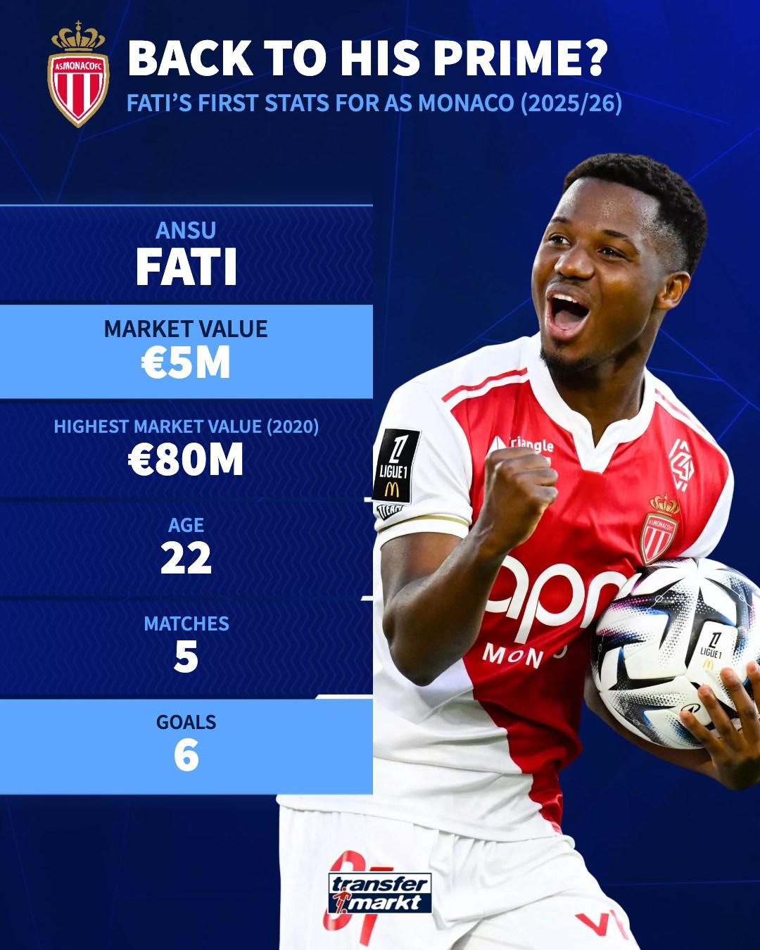 本赛季法蒂被巴塞罗那外租至法甲球队摩纳哥,目前各项赛事登场5次已斩获6粒进球,已经超过他此前两个赛季在巴塞罗那以及布莱顿取得的数据,且效率显著提高。