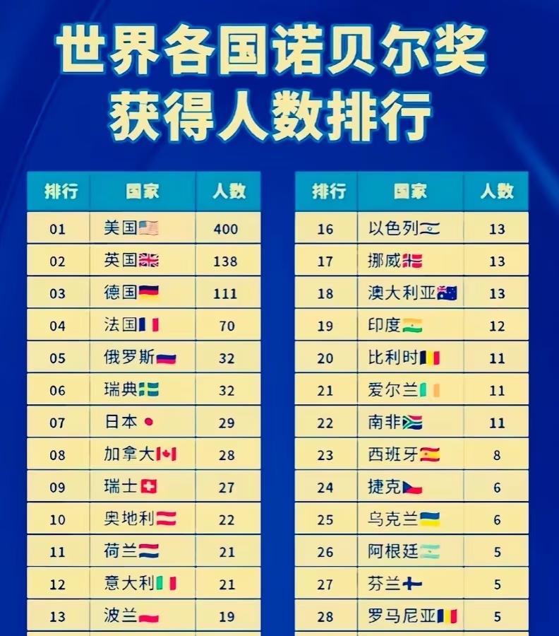 各国诺贝尔奖获得人数排行,美国遥遥领先!