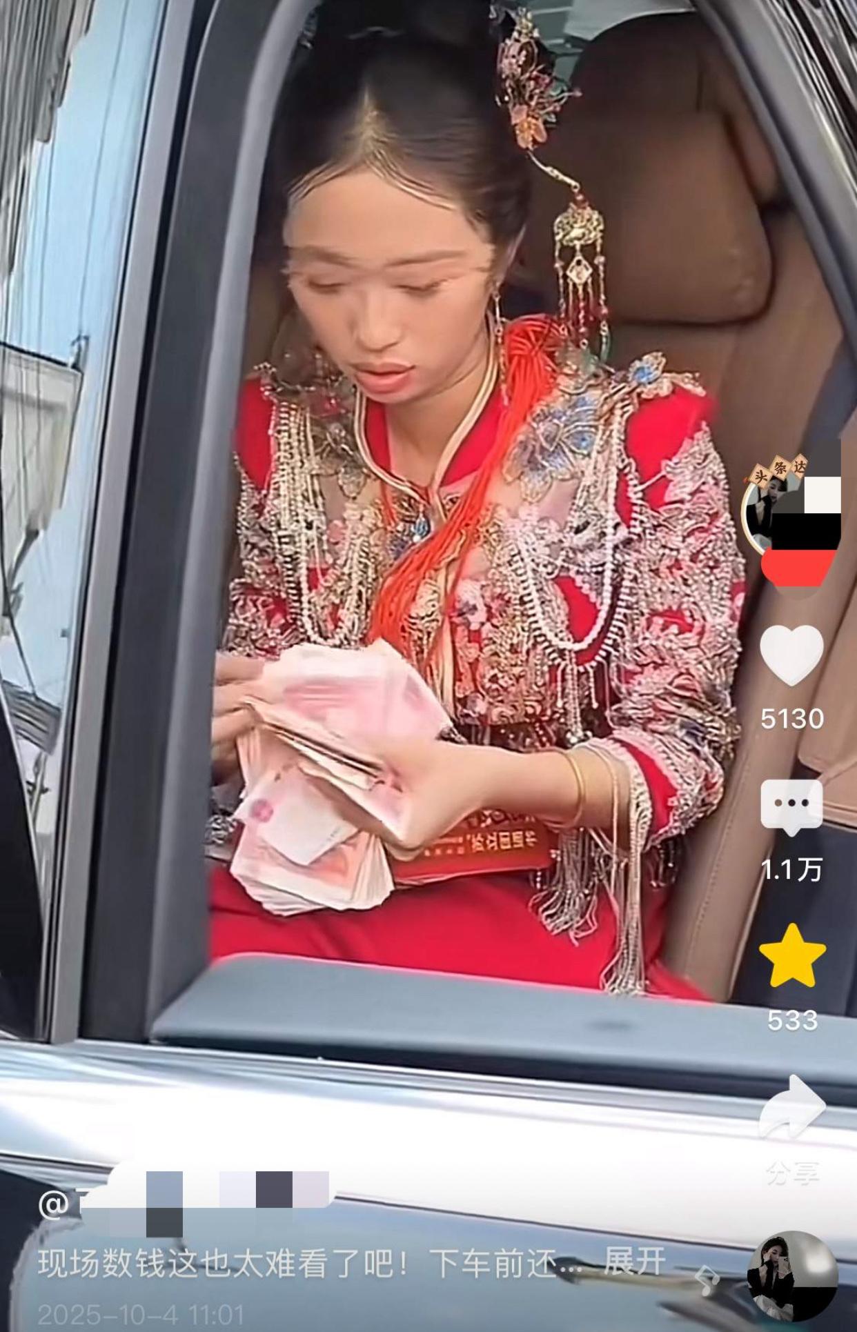 这得把钱看的多重,感情看的有多淡,才能坐在婚车里淡定的数钱,我敢说你们之间没有半点信任,不信任的种子已经埋下,以后生活的点点滴滴都会提现出来,如果我是新郎,这婚不结也罢 婚姻是两个人情投意合的结果,是向所有人宣告主权的仪式,是为了让其他人止步的通告,是宣布新家庭建立的信号,你们硬生生的把它搞成了生意,搞成了扶贫