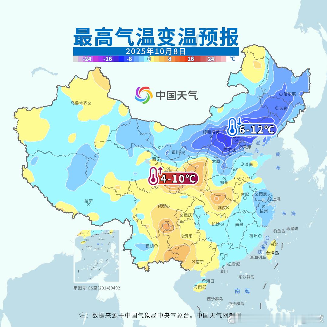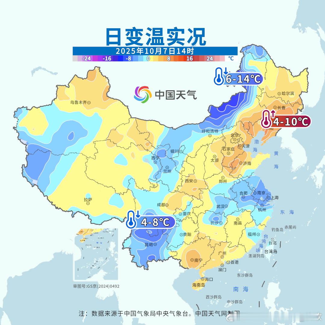【高温和降温】今天截至14时最高,江西湖南浙江站点包揽高温榜前十,湖南衡南38.8℃暂列第一。而且结合相对湿度,湖南衡阳,江西婺源、鹰潭、铅山,体感温度达到42℃以上。浙江建德体感超41℃。另外今天冷空气导致内蒙古东部出现降温,明天冷空气继续东移南下叠加阴雨,华北等地会明显降温、秋凉突显。