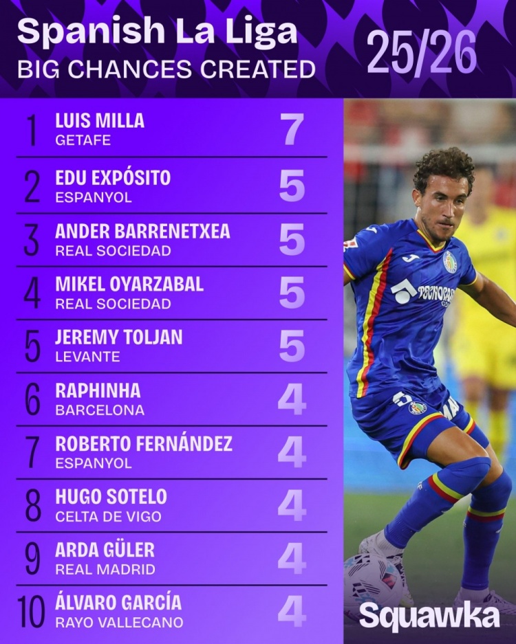 西甲创造进球机会排行:拉菲尼亚、居勒尔4次并列第六