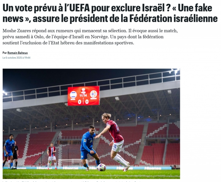 直播吧10月07日讯北京时间10月12日星期日,世预赛欧洲区小组赛I组第7轮,挪威坐镇主场迎战以色列。在这场比赛之前,针对有计划在欧足联进行投票以排除以色列的报道,法国媒体巴黎人报表示,以色列足协主席做出了回应称这是假新闻。
