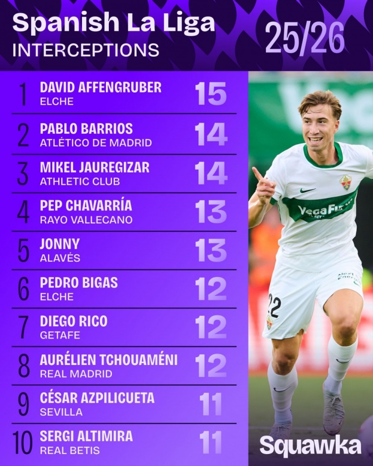 直播吧10月7日讯日前,Squawka统计了本赛季西甲拦截次数排行,巴里奥斯14次并列第2,琼阿梅尼12次并列第6。