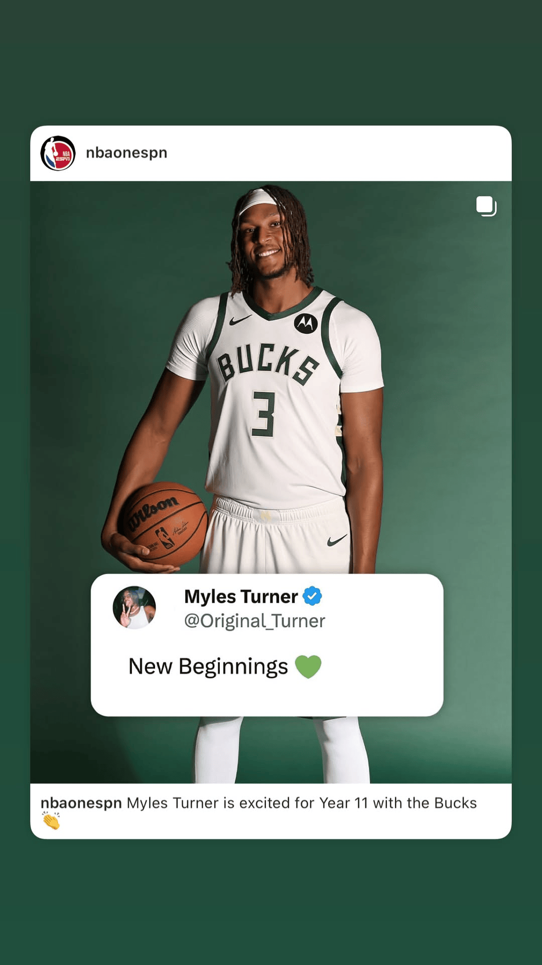 ESPN配文:迈尔斯-特纳对在雄鹿开始的生涯第11年充满期待。