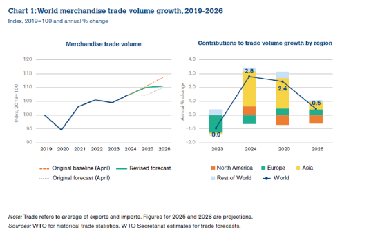 在此背景下,WTO将2025年全球货物贸易增长预期从8月份的0.9%上调至2.4%,同时将2026年预期从之前的1.8%下调至0.5%。作为对比,2025年全球GDP的增长预期为2.7%,2026年为2.6%。