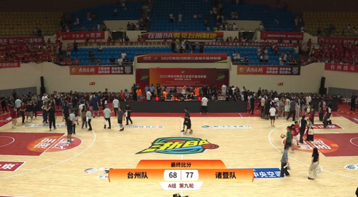 台州队进攻,未能进球,被诸暨队获得篮板,反击得分。