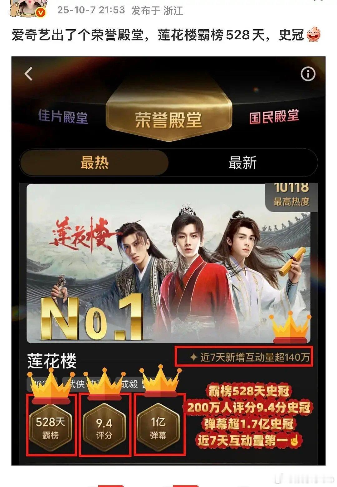 爱奇艺出了个荣誉殿堂,莲花楼霸榜528天,史冠,目前集均已破9300w,长尾仅次