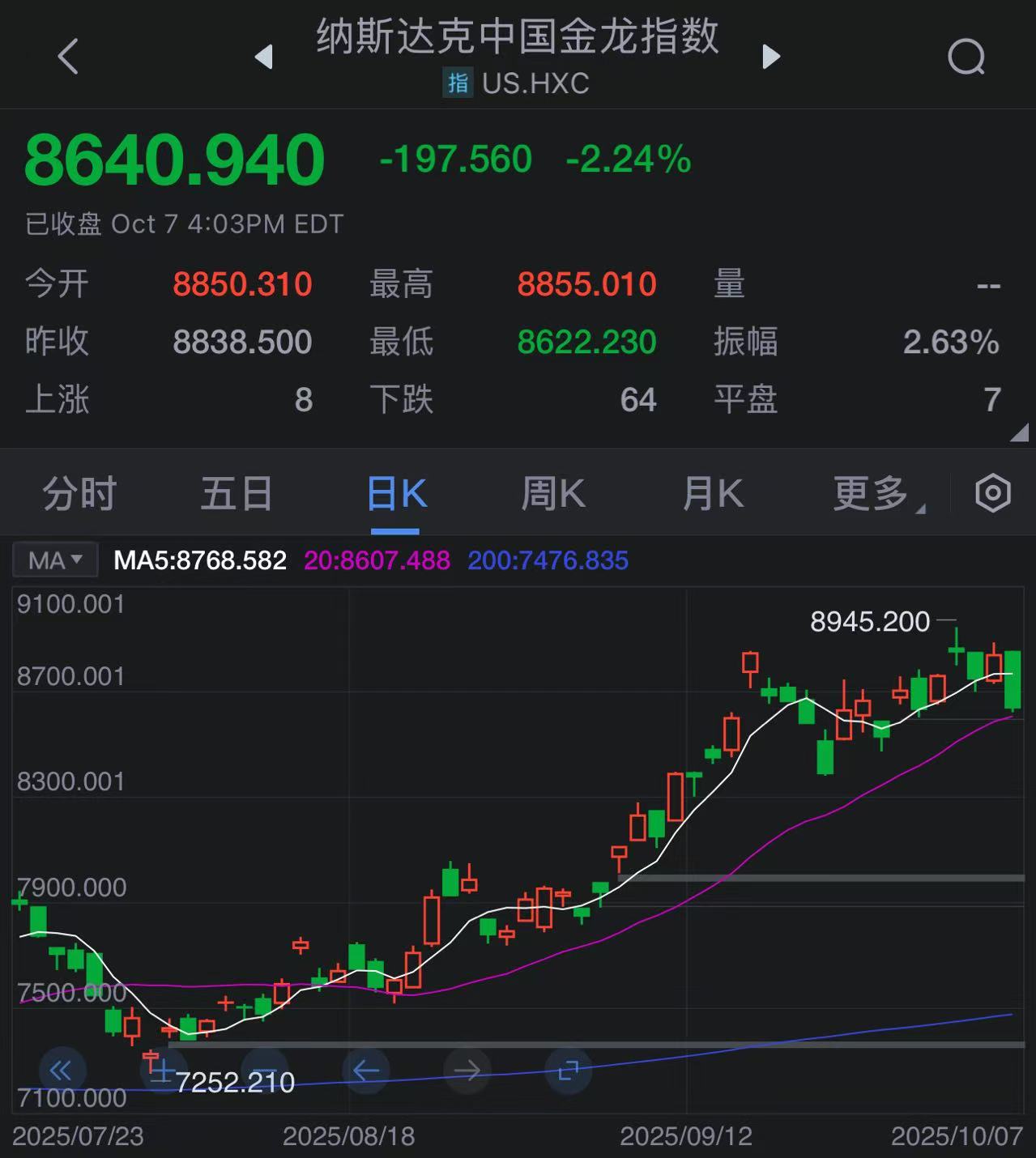 周二纳斯达克中国金龙指数跌2.24%,热门中概股多数下跌。百度跌超4%,阿里巴巴、哔哩哔哩跌约3%,京东、理想汽车跌超2%,百胜中国、蔚来跌超1%。