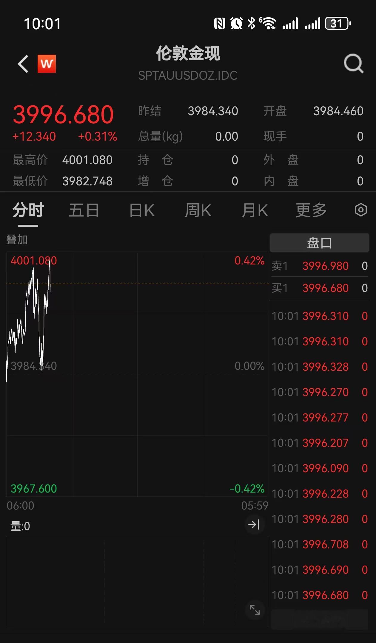上证报中国证券网讯(记者曾庆怡)北京时间10月8日上午,伦敦现货黄金盘中最高价一举突破每盎司4000美元关口,再创新高。Wind数据显示,截至当日10点01分,伦敦现货黄金盘中最高价为4001.08美元/盎司。