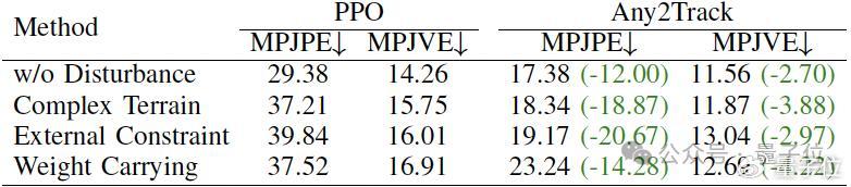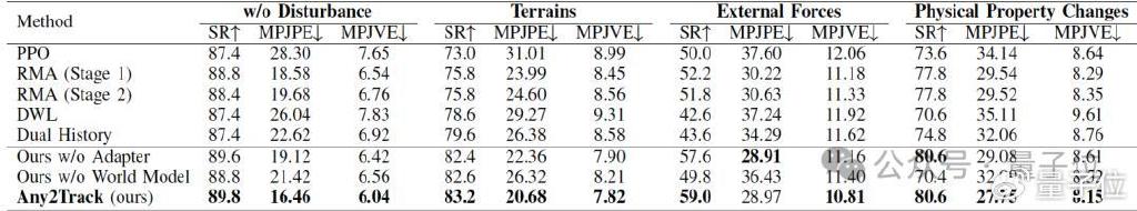 实验结果表明,Any2Track在所有干扰条件下(包括地形变化、外力作用、躯干质量变化、质心位置偏移、关节摩擦差异)均超越了所有基线方法。