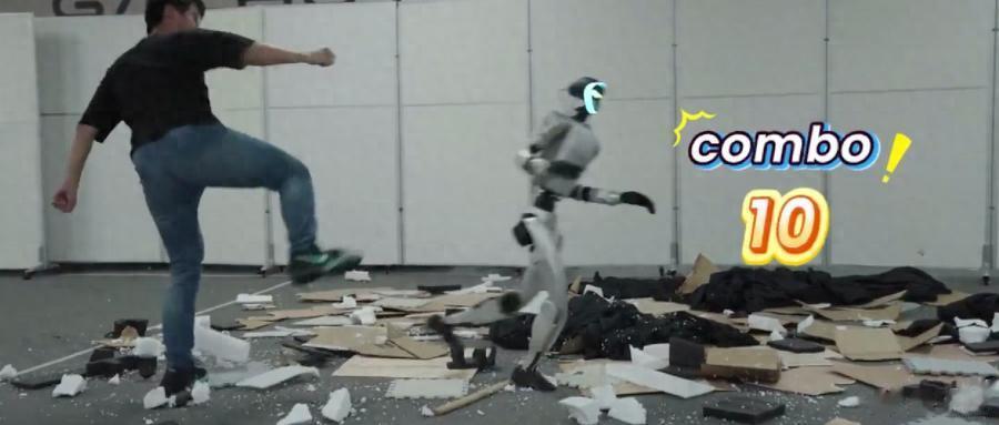 不到半分钟,这台宇树G1就连着挨了十几个飞踢,堪称机生的“至暗时刻”。