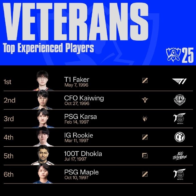 经验最丰富的选手:T1.Faker,1996年5月7日