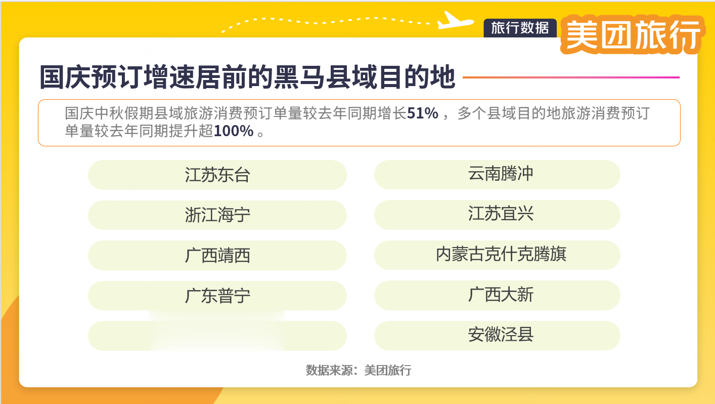 深度旅游时代,更多宝藏小城走进公众视野。美团旅行数据还显示,国庆假期,大城市周边县域目的地预订单量较去年同期增长51%。其中,其中江苏东台、浙江海宁、江苏宜兴、安徽泾县等目的地旅游消费预订单量较去年同期提升超100%。