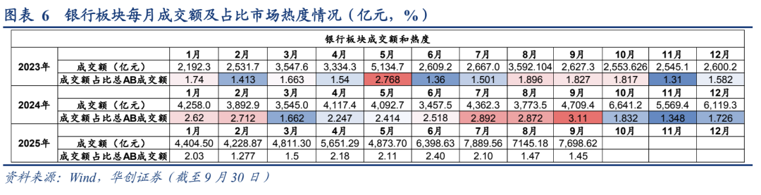 2025年9月权益市场回暖,市场成交量上升,银行月成交额环比上升7.7%至7699亿元。截止9月30日,银行板块成交额同比上升63.5%,占比AB股市场总成交额1.45%,较上月占比下降0.03pct,主要或是由于权益市场回暖,市场风险偏好提升,部分增量资金流入高成长板块,红利板块在交易仍较多的情况下,占比有所下降。