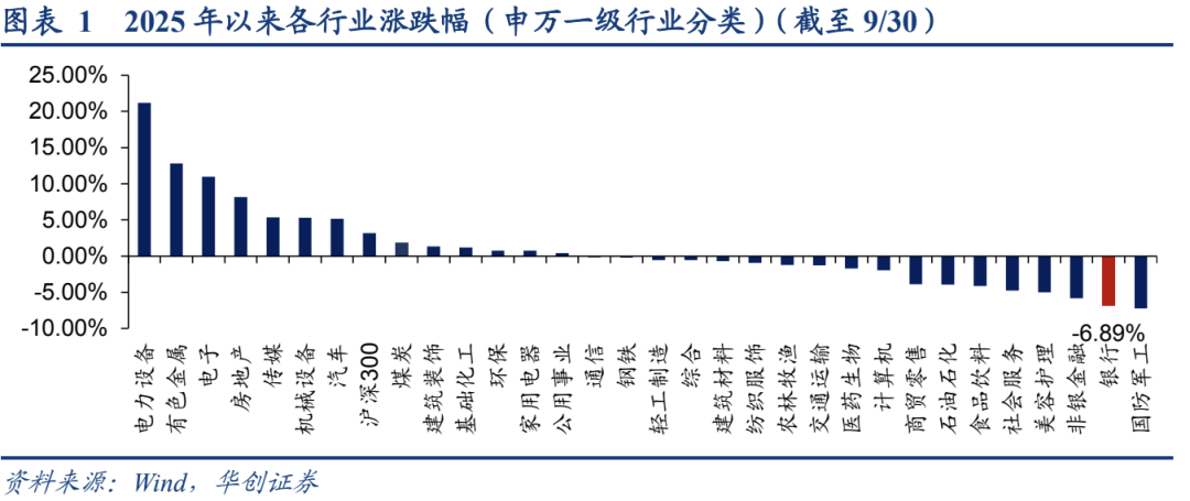 2025年9月1日至9月30日,银行业累计下跌6.89%,跑输沪深300指数10.1pct,涨跌幅在31个申万一级行业中排名倒二。7月之前银行板块涨幅较好,7月之后银行板块有所回调,或主要是市场风格切换,电力设备、有色金属、电子等板块涨幅较好。