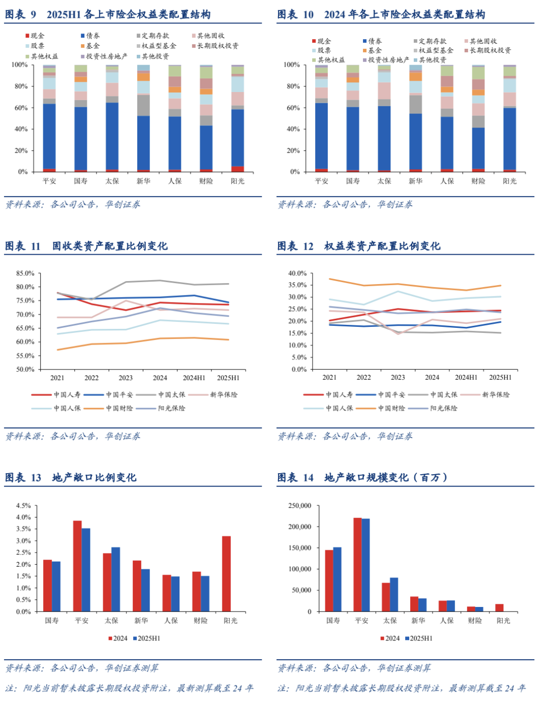 权益类配置占比多数提升,仅太保受股权型理财产品与长期股权投资影响有所下滑。整体权益类资产包括股票、基金、长期股权投资以及其他股权型金融产品,2025H1主要上市险企权益类资产占比降序依次是:财险34.8%(较上年末+0.9pct),人保30.2%(+1.8pct),国寿24.5%(+0.7pct),阳光23.7%(持平),新华21%(+0.3pct),平安19.7%(+1.4pct),太保15.2%(-0.1pct)。