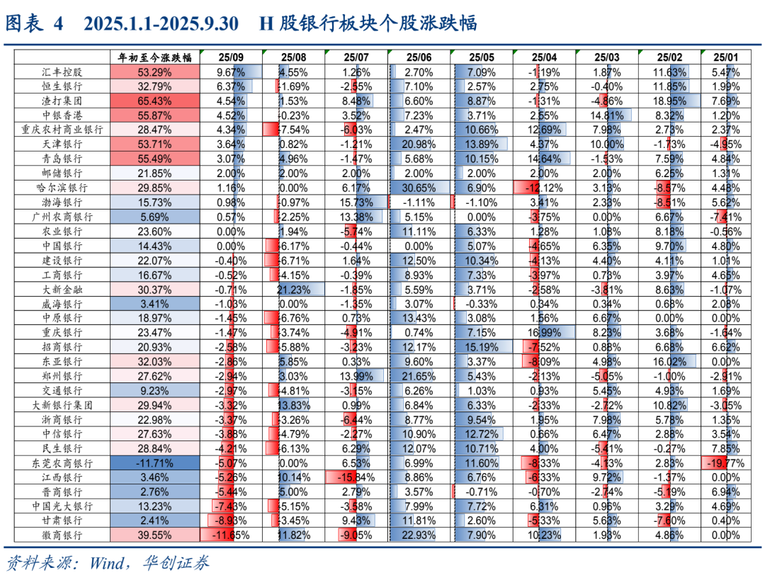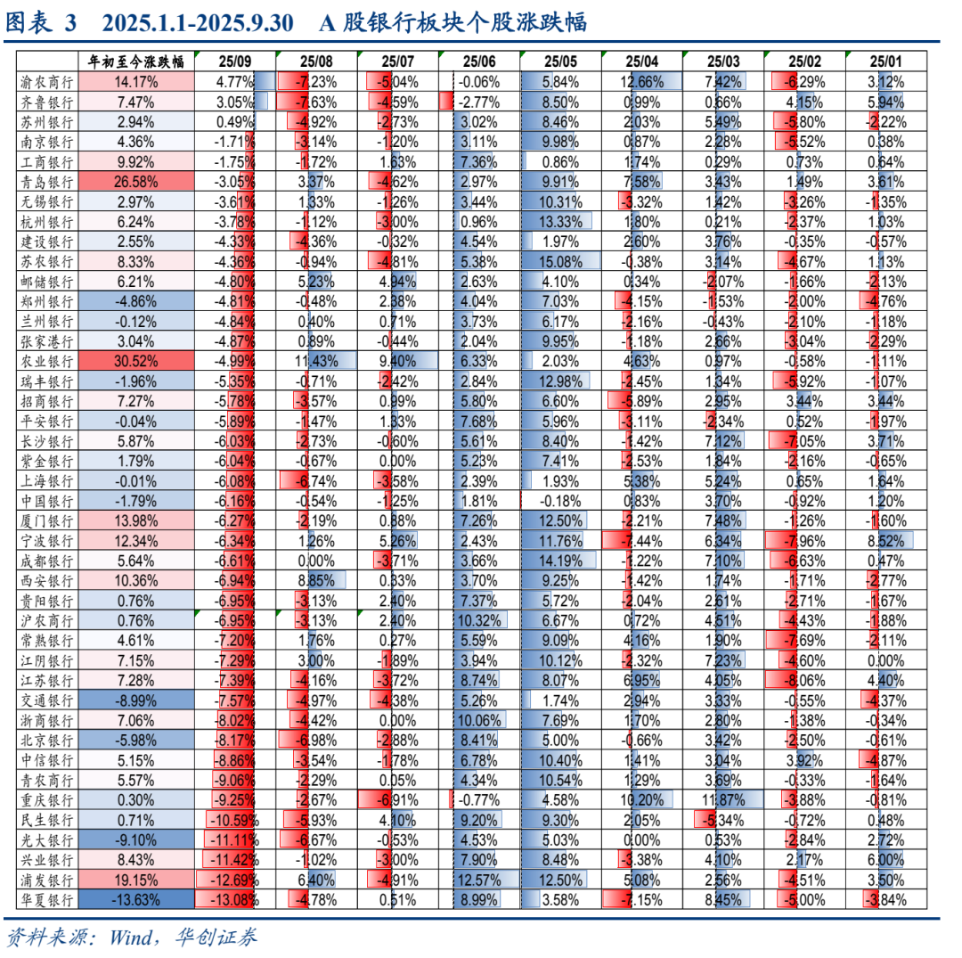 截至9月30日,9月以来A股银行个股中,仅3家城农商行领涨,涨幅靠前的渝农商行(4.77%)、齐鲁银行(3.05%)、苏州银行(0.49%)。均是区域发展较好的城农商行,并且上月渝农商行和齐鲁银行跌幅较大,本月有所回调。多家银行本月下跌,其中华夏银行、浦发银行、兴业银行、光大银行和民生银行等股份行的跌幅较大,本月累计下跌超10%。