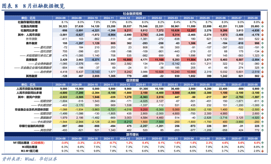 社融增速回落,居民存款继续脱媒。8月社融结束了年初以来同比增速持续上升的态势,较7月增速下降0.2pct至8.8%。社融增速回落主要由于去年同期政府债高基数拖累,今年政府债靠前发力,而去年政府债则在8月之后连续高增,预计后续几个月社融增速仍有可能继续回落。从单月增量来看,贷款仍然是社融增长主要拖累项。8月社融新增2.6万亿,同比少增4630亿,其中社融口径实体经济贷款/直接融资分别同比少增4178亿、-2554亿元,表外融资/其他融资则分别同比多增998亿元/582亿元。从累计增量来看,考虑实体需求仍未明显回暖叠加银行主动调整信贷投放节奏,政府债支持力度也是近5年来最大。2020-2023年,每年1-8月信贷/政府债累计增量平均在11.4/4.4万亿元,2024年1-8月信贷/政府债累计增量分别为8.6/5.4万亿元,2025年1-8月信贷/政府债累计增量分别为7.7/9.6万亿元