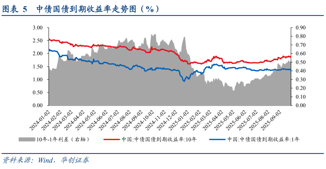 2025年9月上旬和中旬,10年期国债利率呈现上行趋势,月末有所回调。7月份以来由于权益市场回暖,市场风偏上行,9月10年期国债利率继续震荡上行,月末有所回调,从月初1.82%上行至高峰时期的1.90%,月末回调至1.86%。1年期国债利率则保持相对稳定,月初月末在1.37%左右。