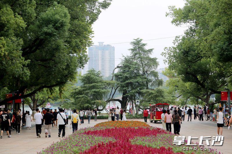 入秋后的湖南烈士公园依然满园翠绿。走进公园南门,主干道沿线红旗招展,与烈士塔交相辉映。国庆主题花坛前,不少前来公园瞻仰缅怀烈士、游园赏景的市民游客正在拍照留念,处处洋溢着喜庆祥和的节日氛围。