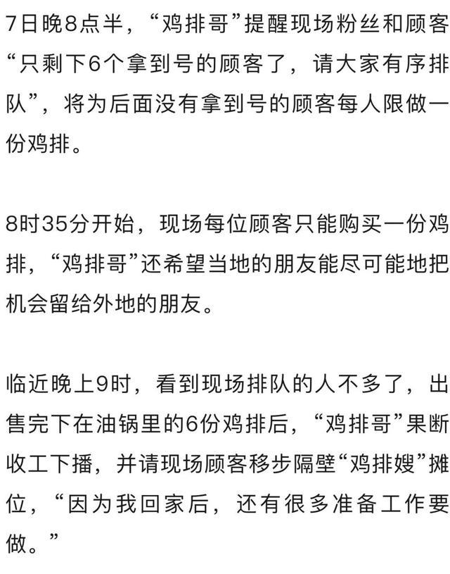 记者从景德镇“鸡排大道”摊主处获悉,6日和7日两天,“鸡排大道”人流量明显回落。记者在“鸡排哥”的直播间内看到,7日晚8时58分,“鸡排哥”销售完当晚的最后一份鸡排提前下班。这两天,“鸡排哥”收工都比平时早。