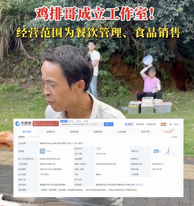 记者查询天眼查发现,近日,景德镇市珠山区李俊永餐饮管理工作室(个体工商户)成立,经营者为李俊永(鸡排哥),经营范围为餐饮管理、食品销售。