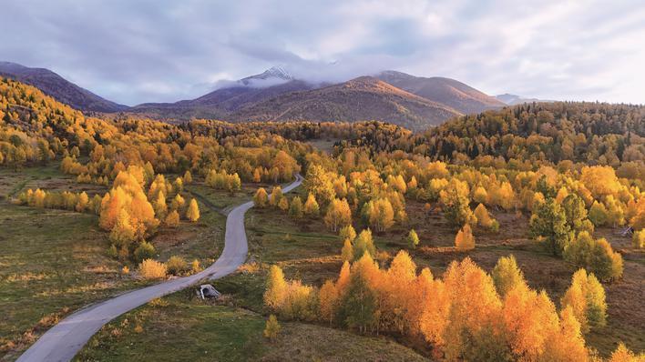 哈萨克斯坦秋景公路蜿蜒如丝线构建纵深空间