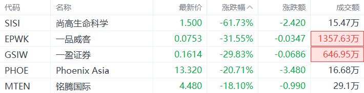 美股异动丨尚高生命科学跌61.73%,为跌幅最大的中概股