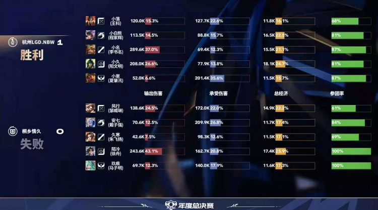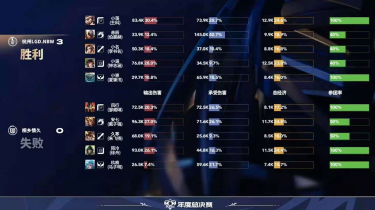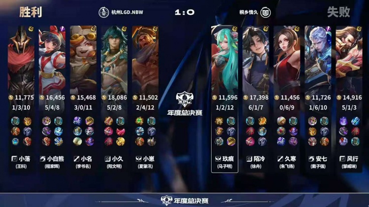 直播吧10月9日讯2025KPL年度总决赛本场比赛是由杭州LGD.NBW对阵到桐乡情久!第一局:LGD入侵野区打出节奏但是情久成功拖到20分钟,LGD抢下龙王后成功拿下胜利!第二局:LGD前期打出优势中期情久野区反制起效但是LGD凭借抓掉点成功抓住机会一波拿下胜利!第三局:LGD前期被情久打出节奏后双方选择和平发育,后期LGD拿下中立资源后成功拿下胜利!