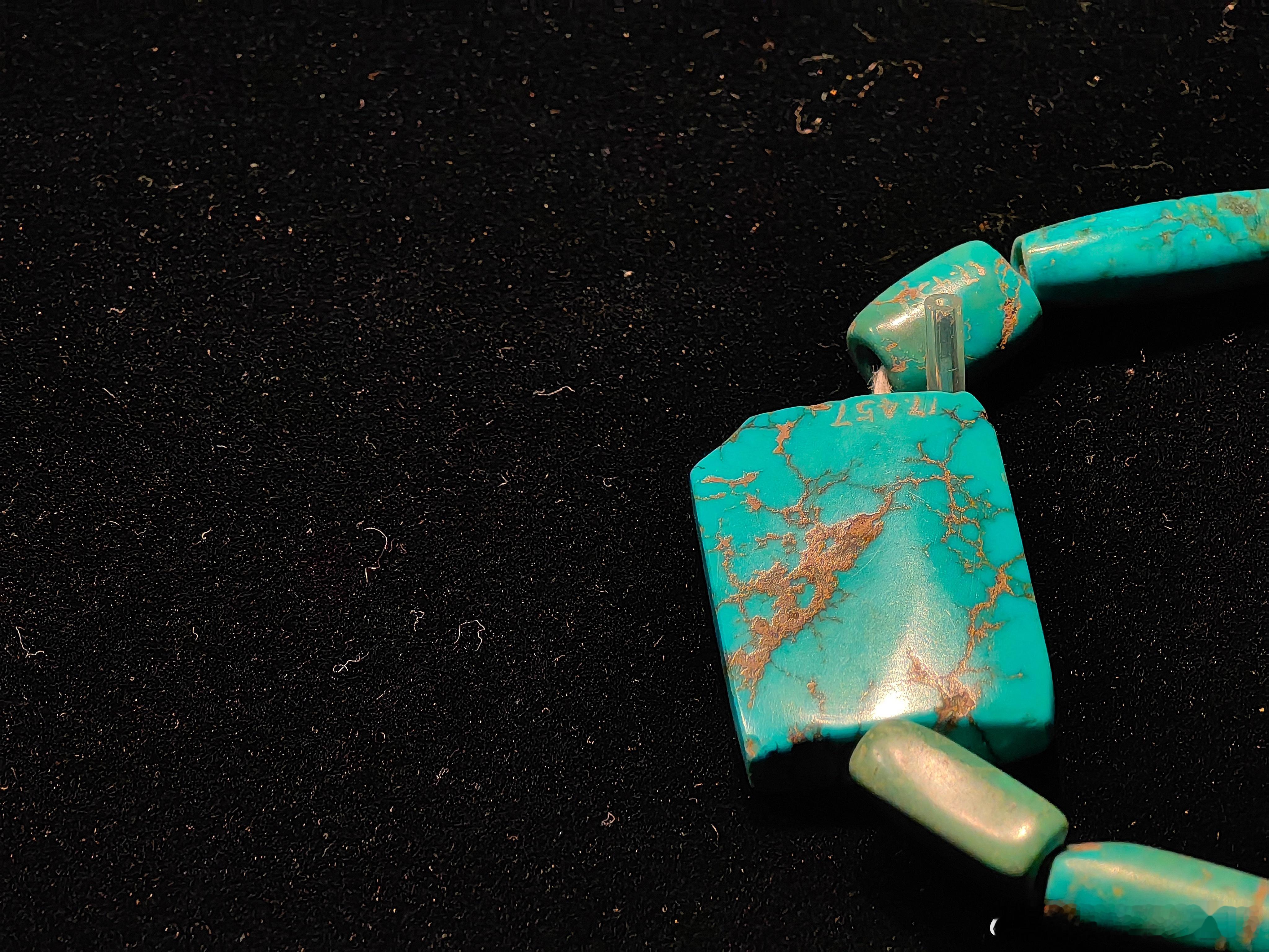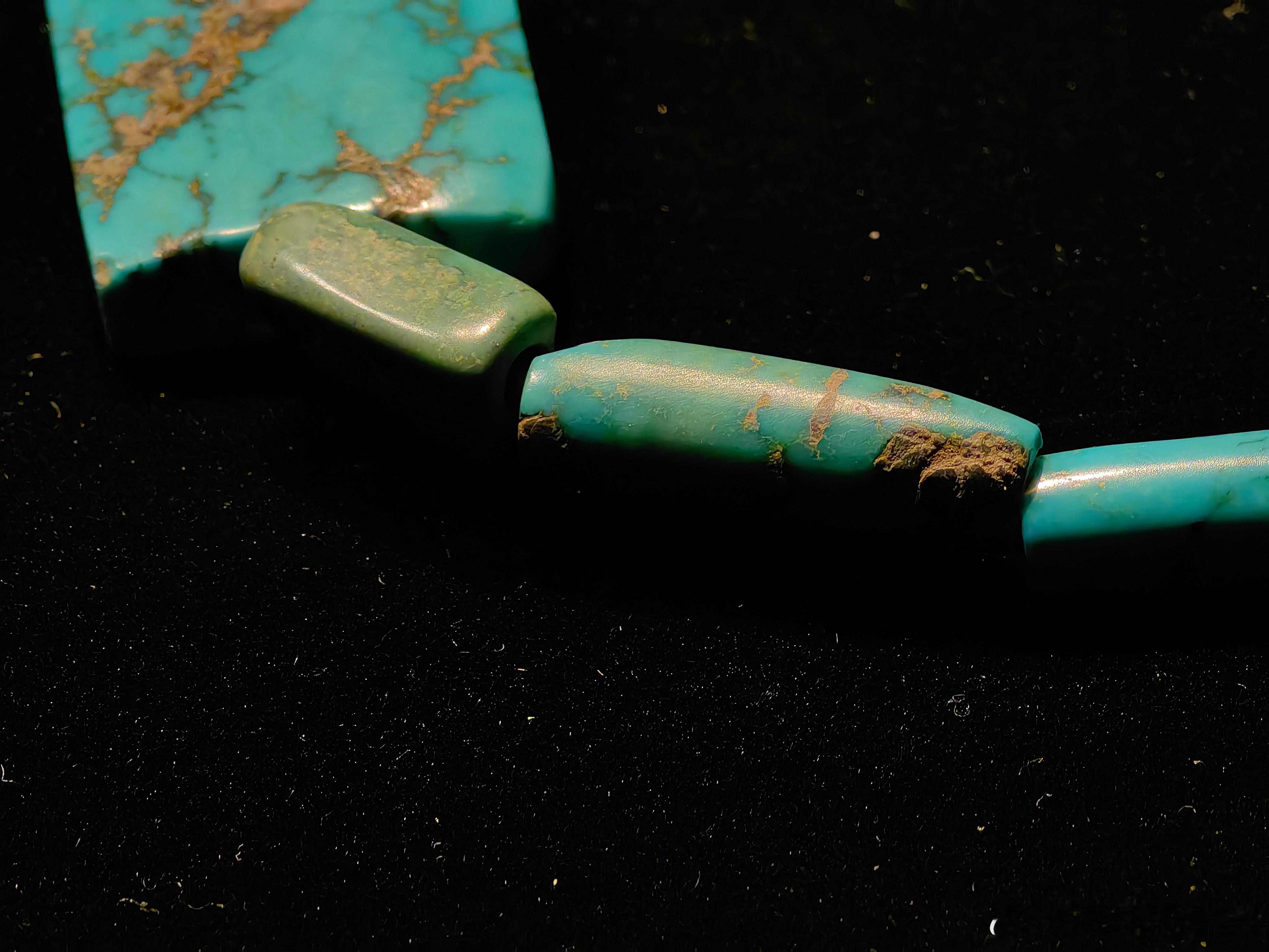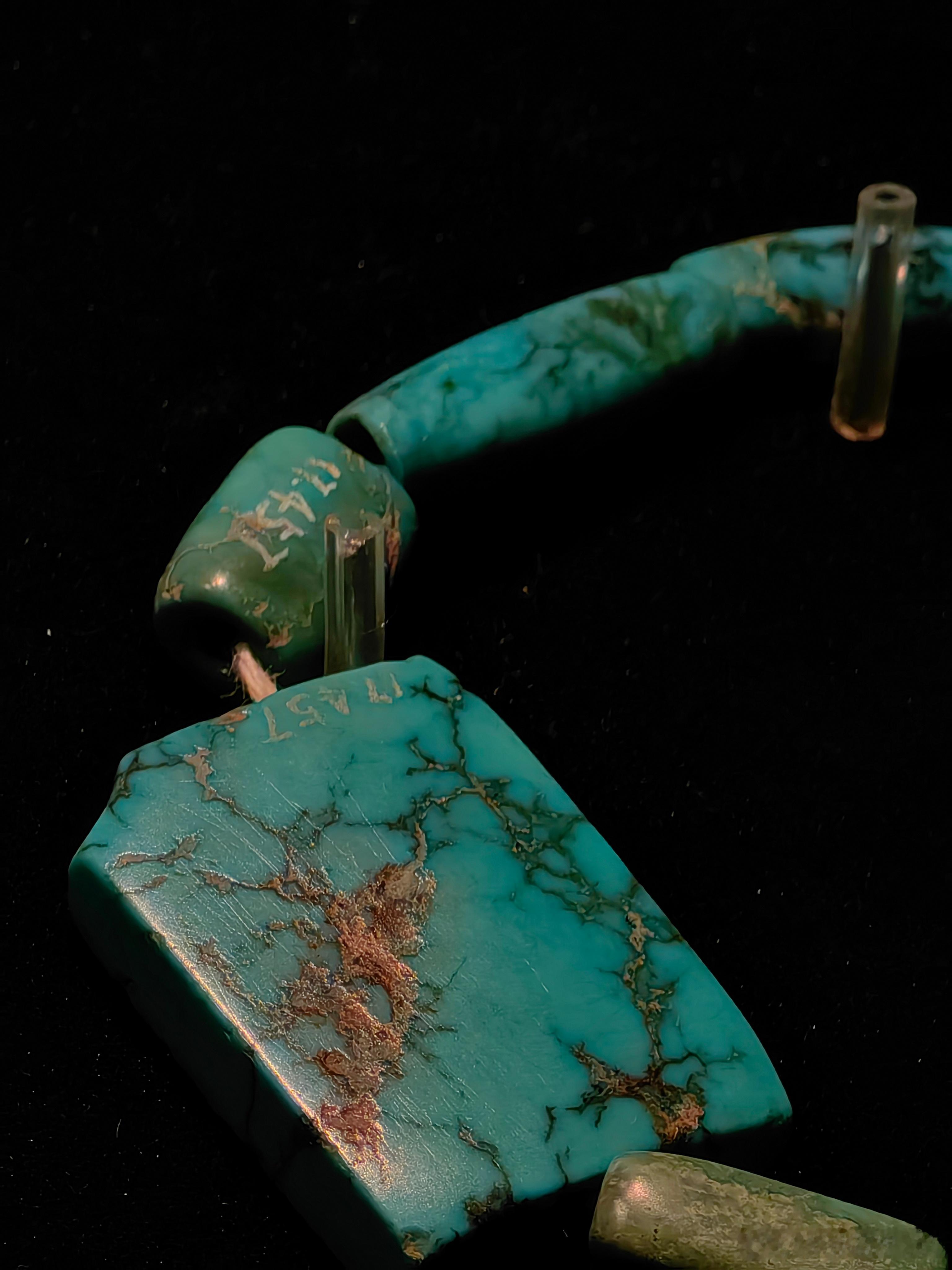 管饰由形状各异的绿松石珠子穿成,有块状、柱状等形态。从其制作工艺来看,虽然处于商代,当时的工匠已经能够对绿松石进行切割、打磨等加工处理,体现了当时较高的玉石加工水平。