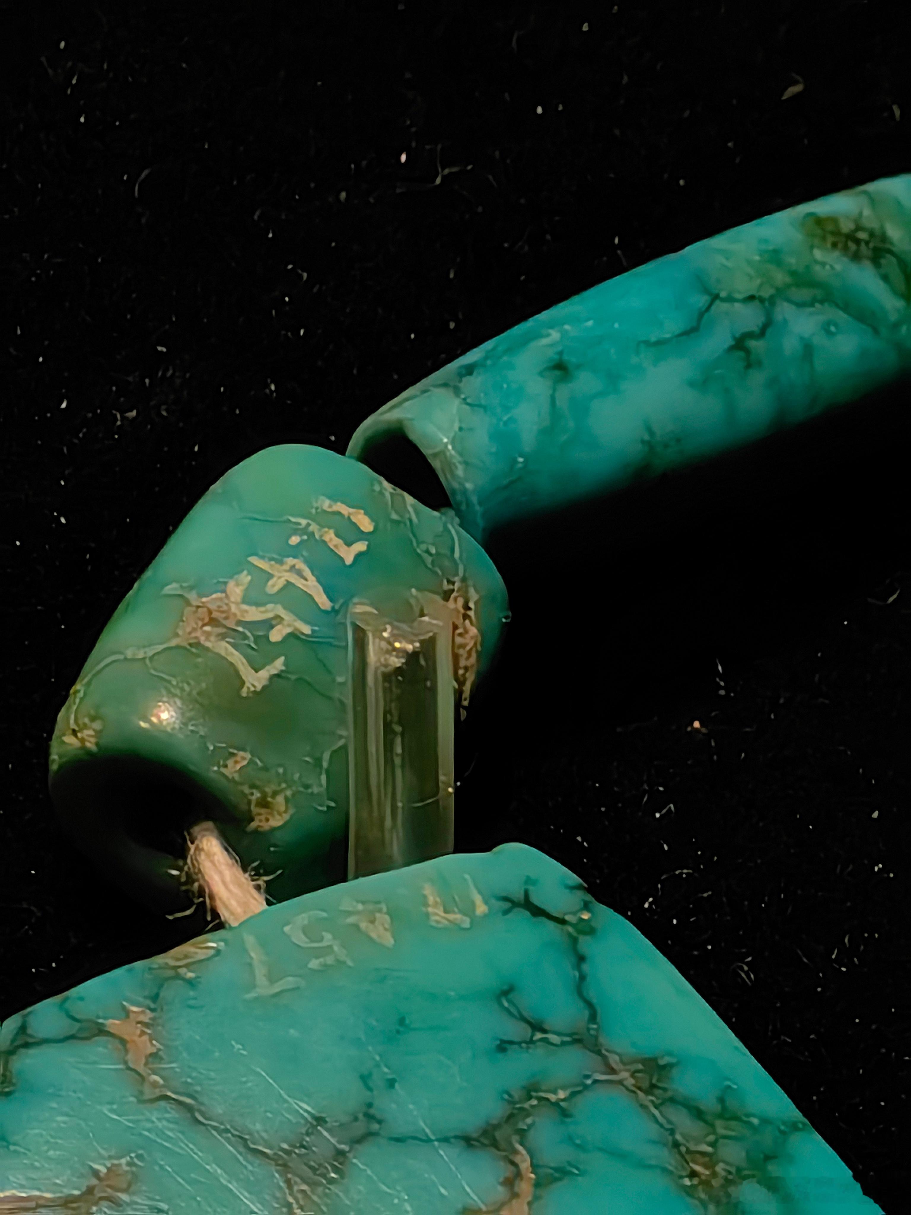 商代是青铜时代的重要阶段,玉器在当时的礼仪、装饰等方面占据重要地位。这串松石管饰不仅反映了商代的审美观念和工艺水平,也为研究当时的社会风俗、宗教信仰、玉石贸易等提供了实物资料。它可能是贵族佩戴的装饰品,用以显示身份地位,也有可能具有一定的宗教或礼仪用途。