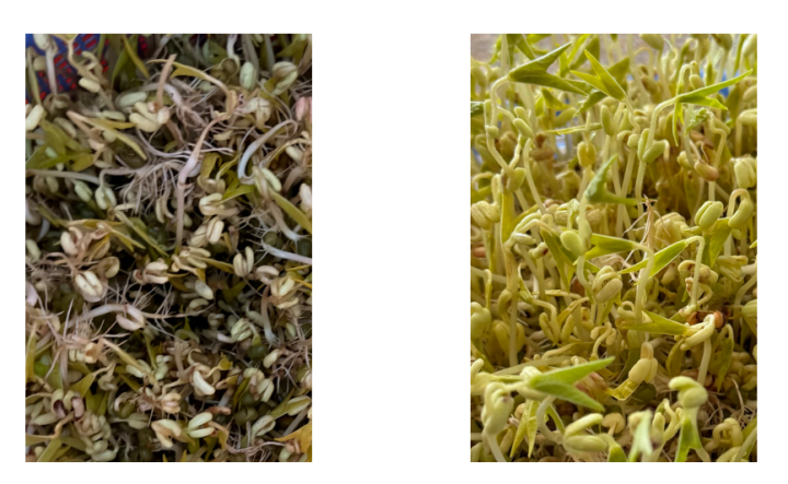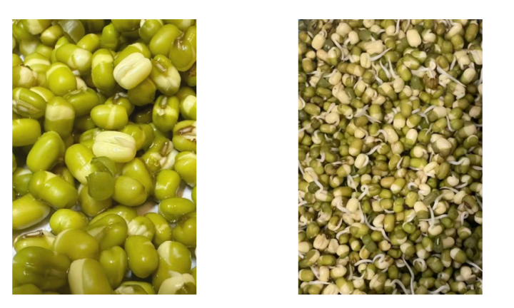 “10月1号那天,我带孩子回了诸暨奶奶家,先把这个任务交给了婆婆。我婆婆以前做过豆腐,对豆制品很了解,她就去菜场买了一斤绿豆,拿了一两出来播种。她为了这盆绿豆还专门买了一个桶和滤篮,然后把绿豆均匀地铺在滤篮里,放入水桶里,水桶底部装满水,拿一块布盖好,一天浇3次水。没想到第二天芽头就冒出来了。孩子觉得很新奇,时不时就要过去看一看。”